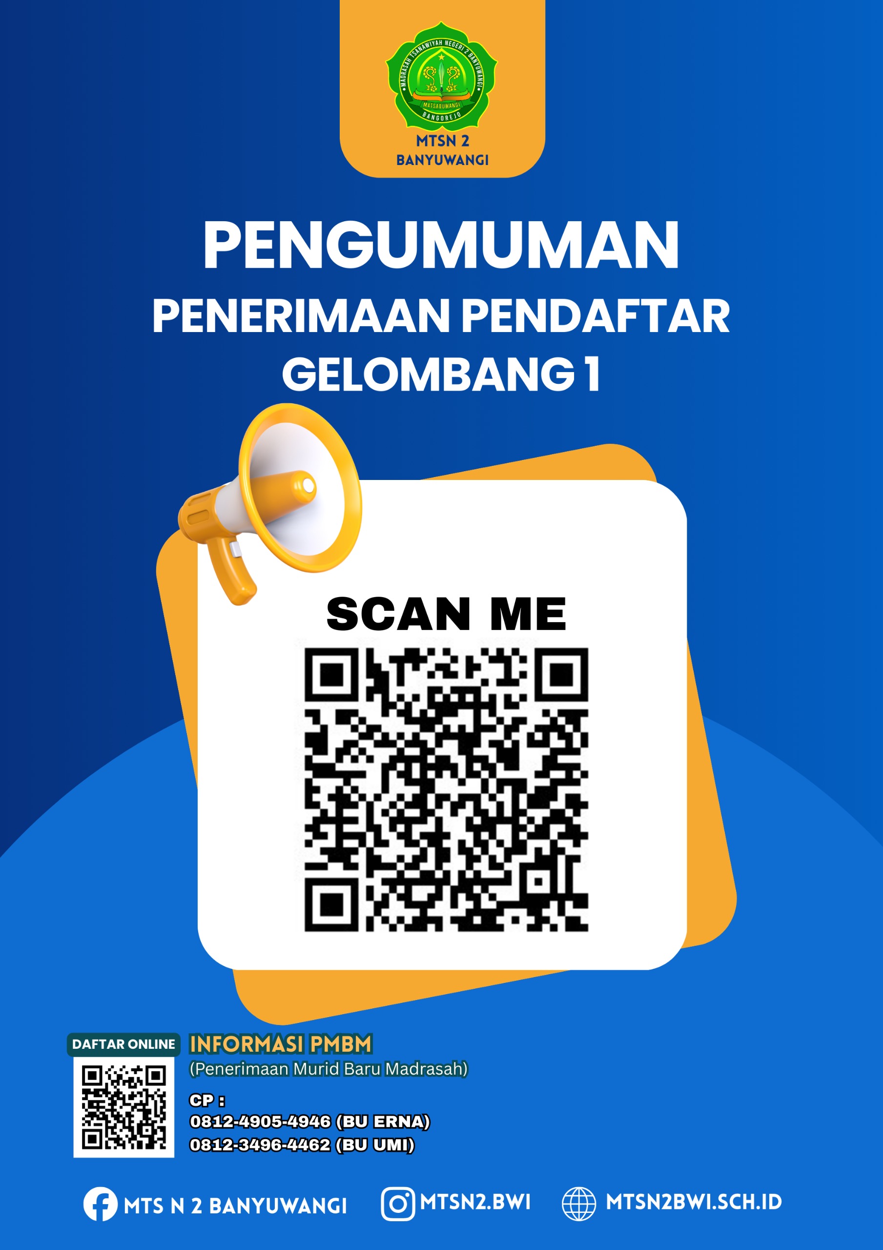 Pengumuman Penerimaan Murid Baru Madrasah (PMBM) Gelombang 1 MTsN 2 Banyuwangi. Assalamualaikum Wr.Wb. Selamat kepada calon murid baru yang telah dinyatakan lolos seleksi Gelombang 1